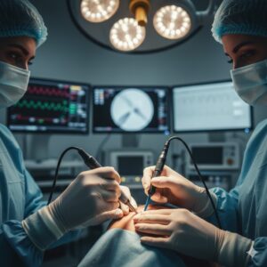 Bir saç ekimi kliniği laboratuvarında veya ameliyathane ortamında, modern ekipmanlarla (örneğin Safir FUE için kalem ucu, DHI için choi kalemi) çalışan, üzerinde cerrahi önlük olan uzman ellerin yakın çekim görüntüsü. Arka planda hafif bulanık modern cihazlar ve bilgisayar ekranları görünüyor. Görselde teknoloji ve uzmanlık hissi ön planda olmalı. Hijyenik ve profesyonel bir atmosfer hakim. **